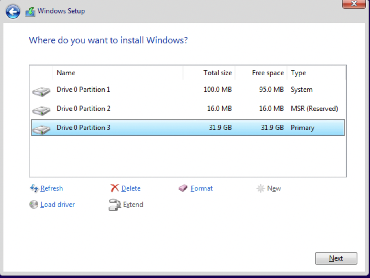 • Select largest of the newly-created partitions, then click 'Next'.