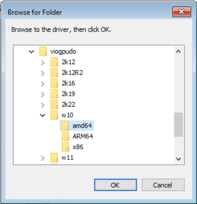 • Find and select the 'Viostor' directory, then choose the directory that corresponds to your operating system version. Choose the 'amd64' directory inside and click 'OK'.